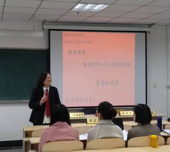 行政诉讼实训课的课堂上,走进了一位神采飞扬的女法官—青岛市崂山区人民法院行政庭副庭长贾瑞红法官。她专业的讲解和庭审后的精彩点评,让同学们如同享受了一顿庭审大餐,受益匪浅。