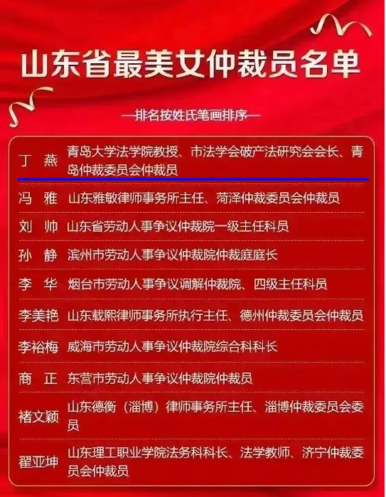 教授、市法学会破产法研究会会长、青岛仲裁委员会仲裁员丁燕获评“最美女仲裁员”。是青岛市唯一获此殊荣的仲裁员。